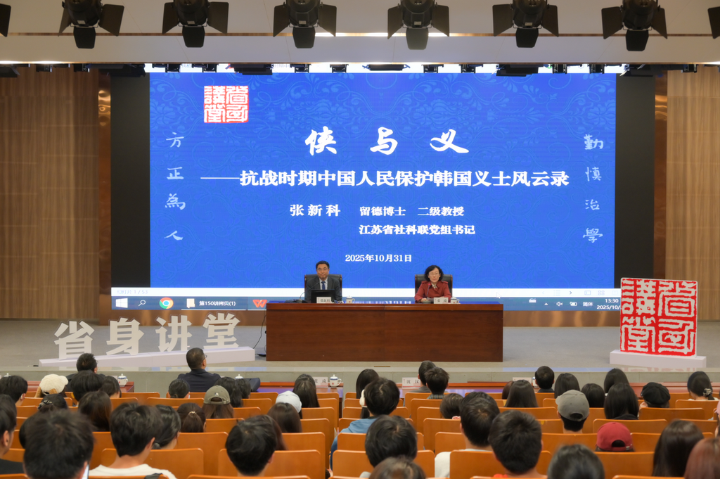 10月31日,江苏省社科联党组书记、常务副主席张新科教授应邀作客我校省身讲堂第150讲,作题为《侠与义——抗战时期中国人民保护韩国义士风云录》的学术报告。党委委员、副校长张琦主持报告会。