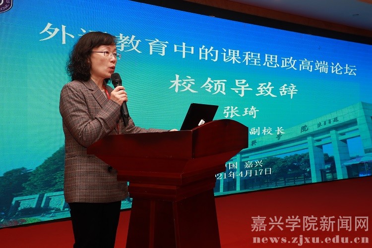 我校副校长张琦致欢迎词。她表示,嘉兴学院作为中国革命红船起航地高校,充分发挥在党的诞生地办学的政治优势,牢记为党育人、为国育才的初心使命,大力弘扬红船精神,深入开展红船精神学术研究、铸魂育人与辐射传播。学校充分挖掘独特的政治资源,持续推进以红船精神学术研究支撑课程思政资源建设、以教学研究带动课程思政模式创新,全面提升教师思政育人能力,落实立德树人根本任务,大力实施课程思政提升工程,着力构建全员全程全方位育人大格局,已初步形成符合人才成长规律、体现时代要求、彰显红船精神特色的课程思政体系。她希望通过本次高端论坛,凝聚发展共识、汇聚创新力量,共享外语课程思政建设成果,共同探索外语教育高质量创新发展之路,共谋百年变局下外语育人新格局,培养政治素质高、专业功底强、国际视野宽,具有浓厚家国情怀和时代创新精神的高素质国际化人才。