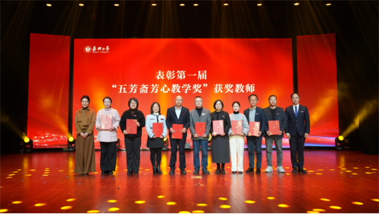 王伟、王立玮为第一届“五芳斋芳心教学奖”获奖教师代表颁奖。