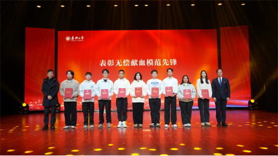 张瑜、王立玮为无偿献血模范先锋代表颁发荣誉证书。