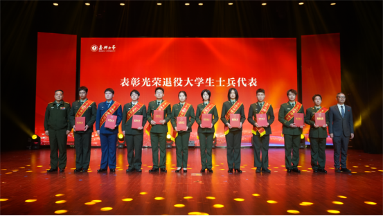 王德阳、周宏伟为光荣退役大学生士兵代表颁奖。