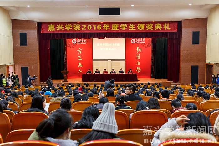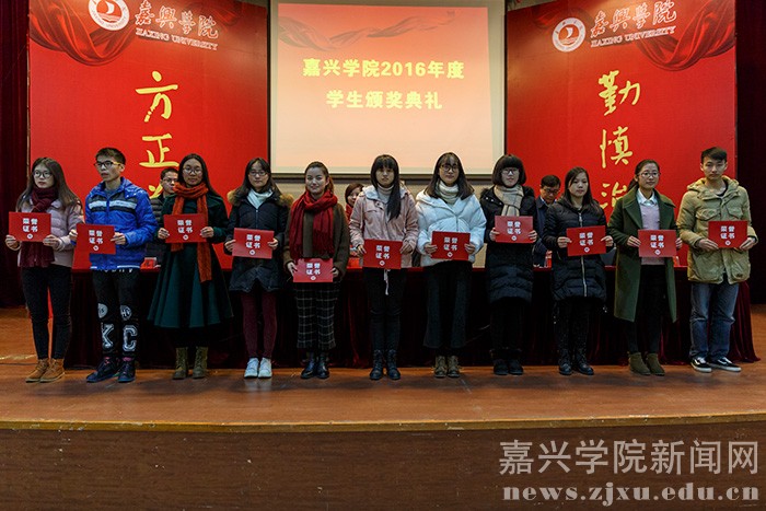 12月30日下午,嘉兴学院2016年度学生颁奖典礼在越秀校区教二报告厅举行。校党委副书记严从荃、副校长周珊出席典礼,近600名师生参加颁奖典礼。大会宣读表彰了嘉兴学院2015-2016学年各类学生获奖个人和集体。严从荃、周珊等一一为获得国家奖学金、学习优秀奖学金、优秀学生和优秀学生干部、校标兵班级、学习型寝室、学科竞赛获奖团体、五四红旗团支部等7类学生获奖代表颁发荣誉证书。