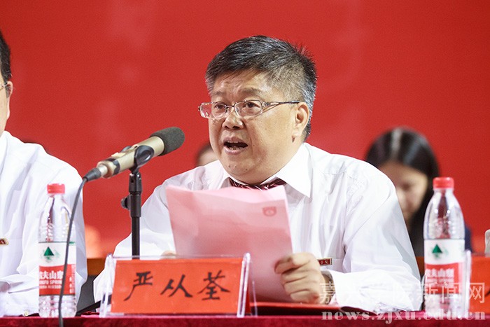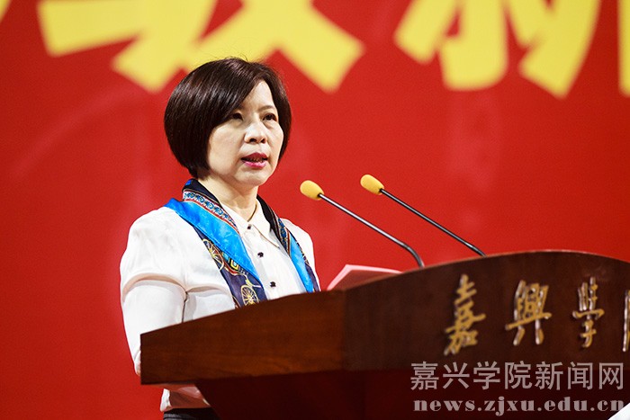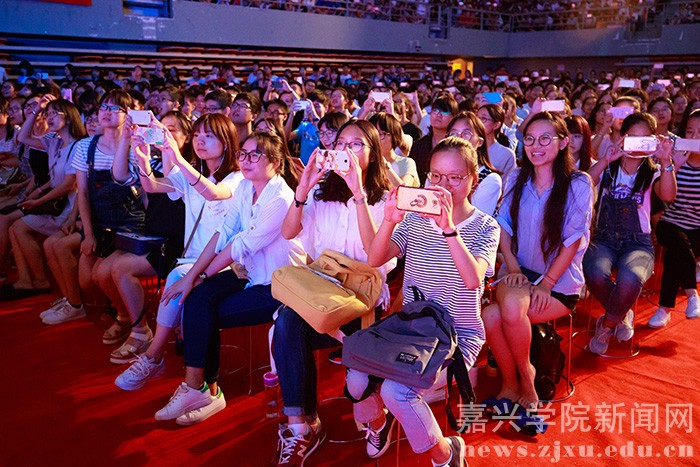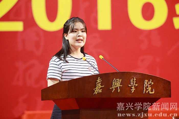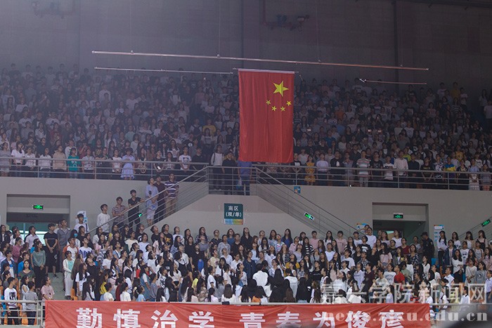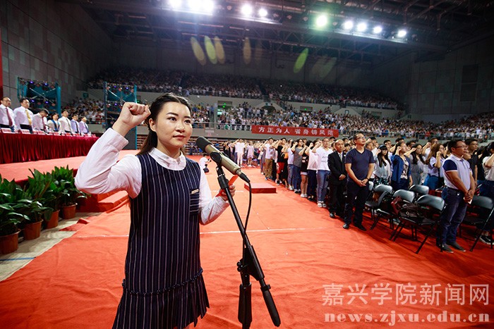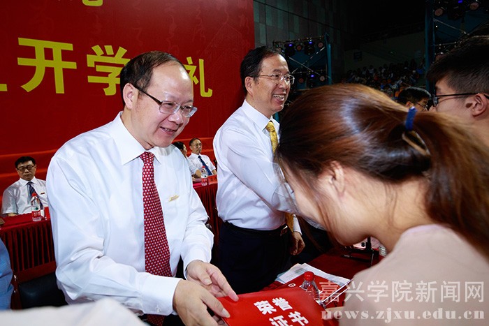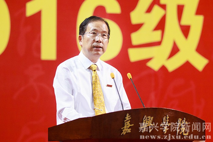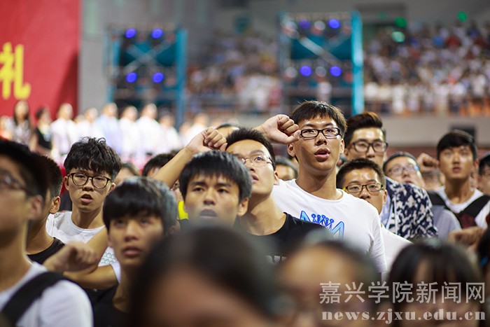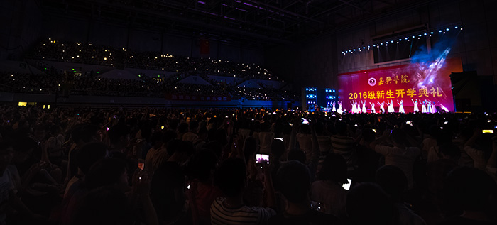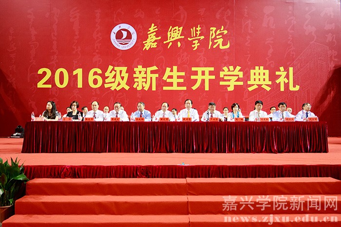 9月25日晚,嘉兴学院2016级新生开学典礼在嘉兴体育馆隆重召开。学校党政领导、教师代表及2016级新生共计6200余人参加典礼。校党委副书记严从荃主持大会,副校长周珊宣读 2016 级新生奖学金表彰决定,获奖的新生代表上台领奖。教师代表、新生代表发言后,全体新生面向国旗庄严宣誓。在热烈的掌声中,校长盛颂恩致辞。他向2016级全体新同学表示热烈欢迎和衷心祝福,并向广大新同学提出了殷切希望。开学典礼结束后,校大学生艺术团为师生们献上了一场精彩的文艺演出。