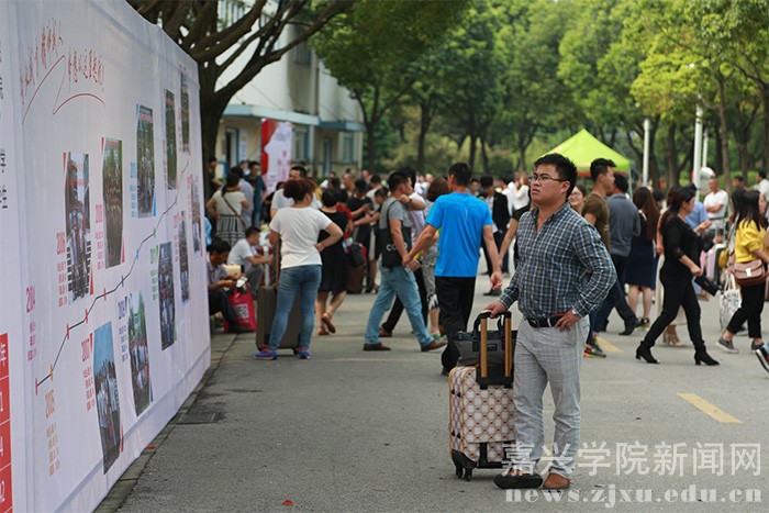 温馨而富有青春活力的欢乐氛围也是今年迎新工作的一大亮点。校园内道路两侧,几十米展示学校师资队伍、校园文化、社团活动、校风校貌的大型喷绘,吸引了众多新生和家长驻足。在新生报到入口处,学生处用数千名大一新生头像照片组成的四枚巨大又别致的二维码,让新生们眼前一亮;而附有嘉兴学院优秀毕业生熊顿抗癌斗争事迹的签名墙,更传递给了新生们勇敢面对困难挫折的信心和勇气。