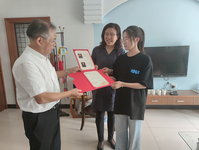 近日,校党委副书记钱方明带领学生工作处主要负责人前往浙江海宁,为“省内提前批次基层卫生定向”临床医学专业2022级新生张可人同学送出了嘉兴学院2022年本科生首封录取通知书。