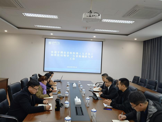 3月1日,平湖市委组织部副部长朱磊、平湖市委人才办专职副主任侯四海、平湖市科技局副局长徐欣等一行来访学校,共商2022年平湖市与学校合作共同育引人才事宜。人事处处长郝文静、副处长张鼎、丁宝月及相关科室人员参加会议。