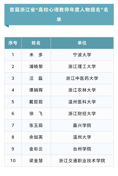 近日,省高等教育学会思想政治教育研究分会公布首届浙江省“高校心理健康教育年度人物”选树活动名单,我校大学生心理健康教育中心主任张玉茹老师获首届浙江省“高校心理教师年度人物提名”称号。