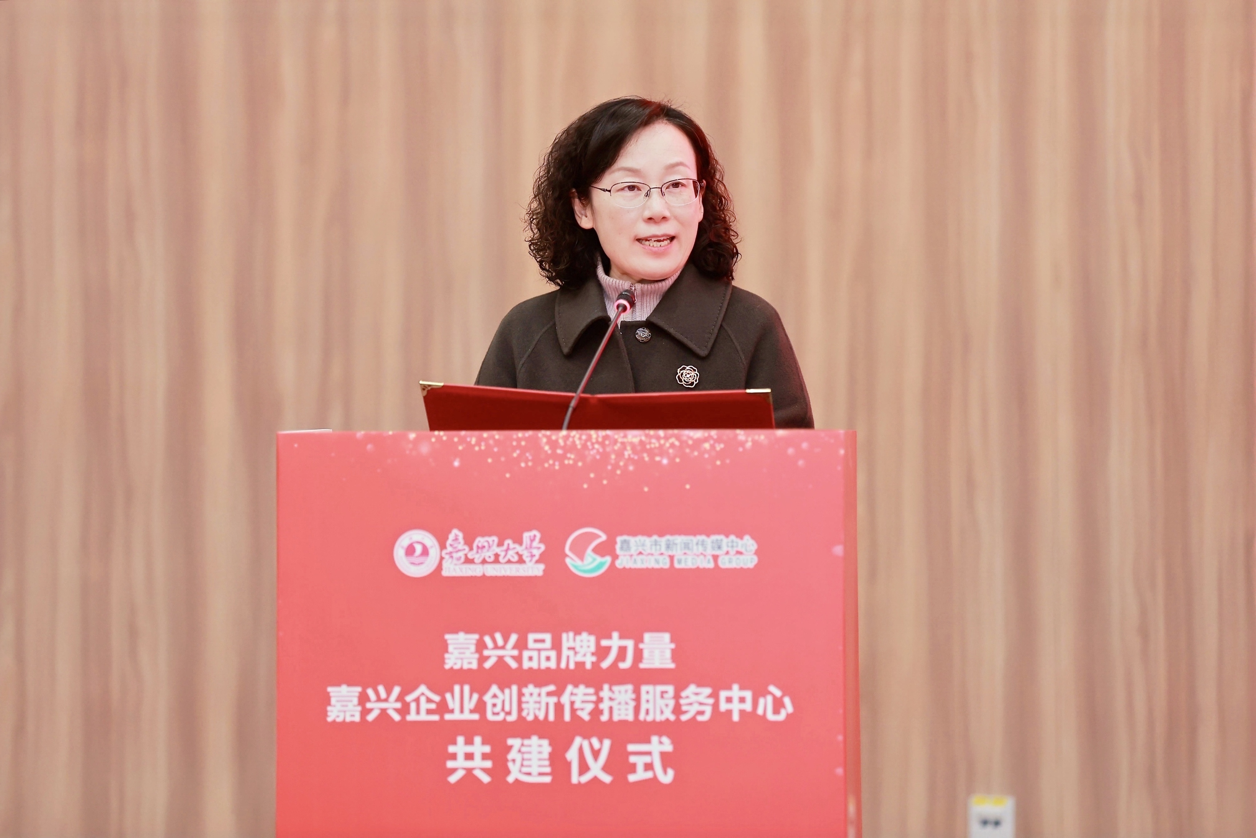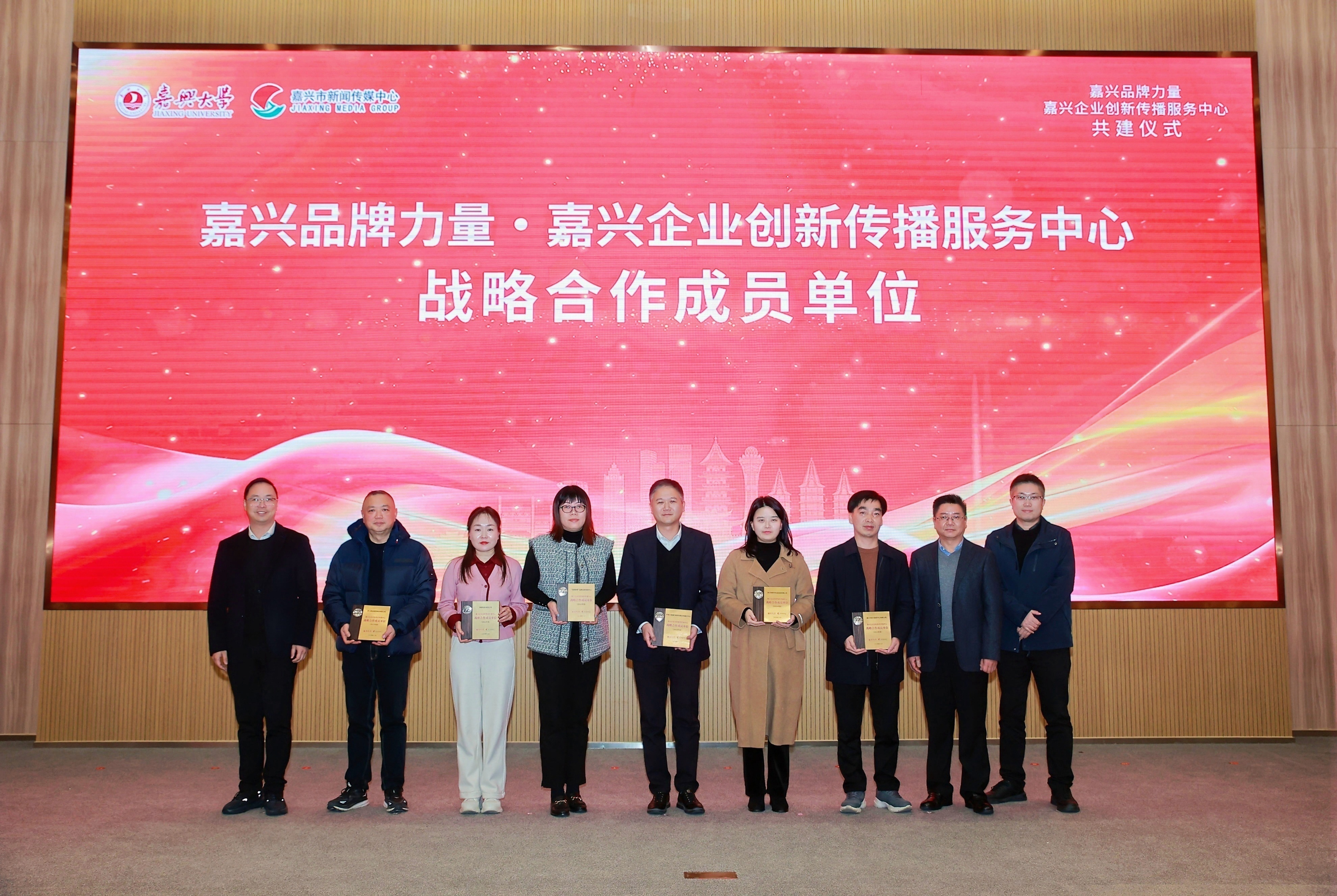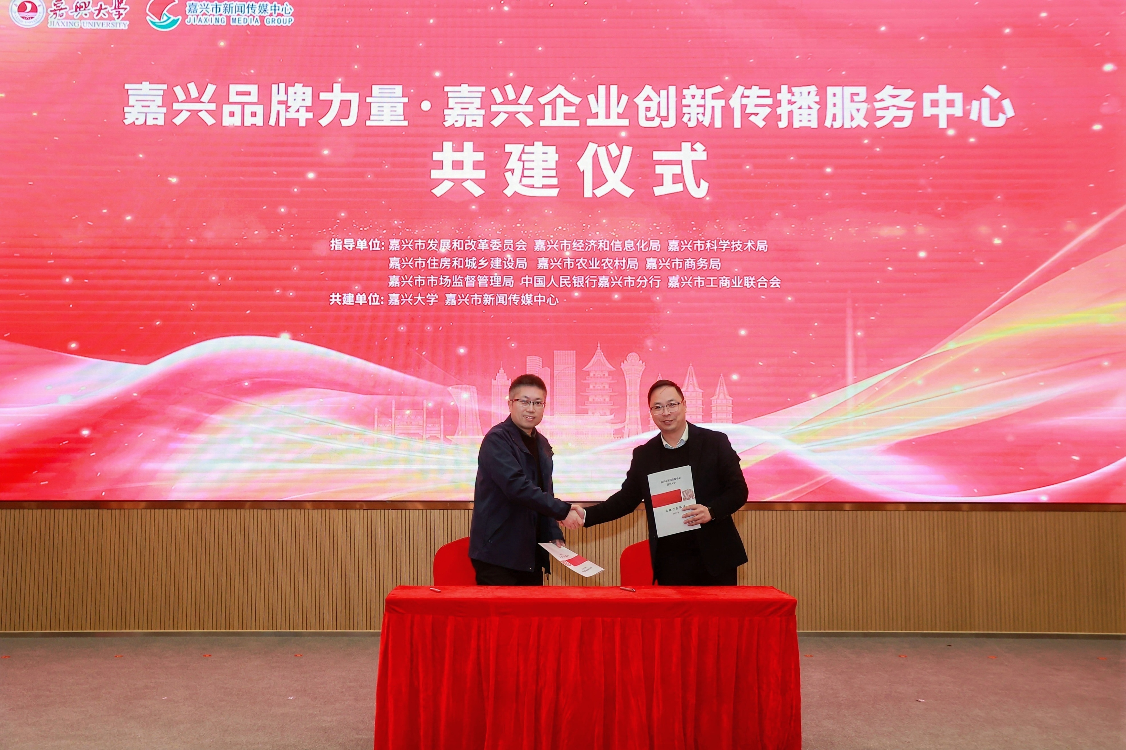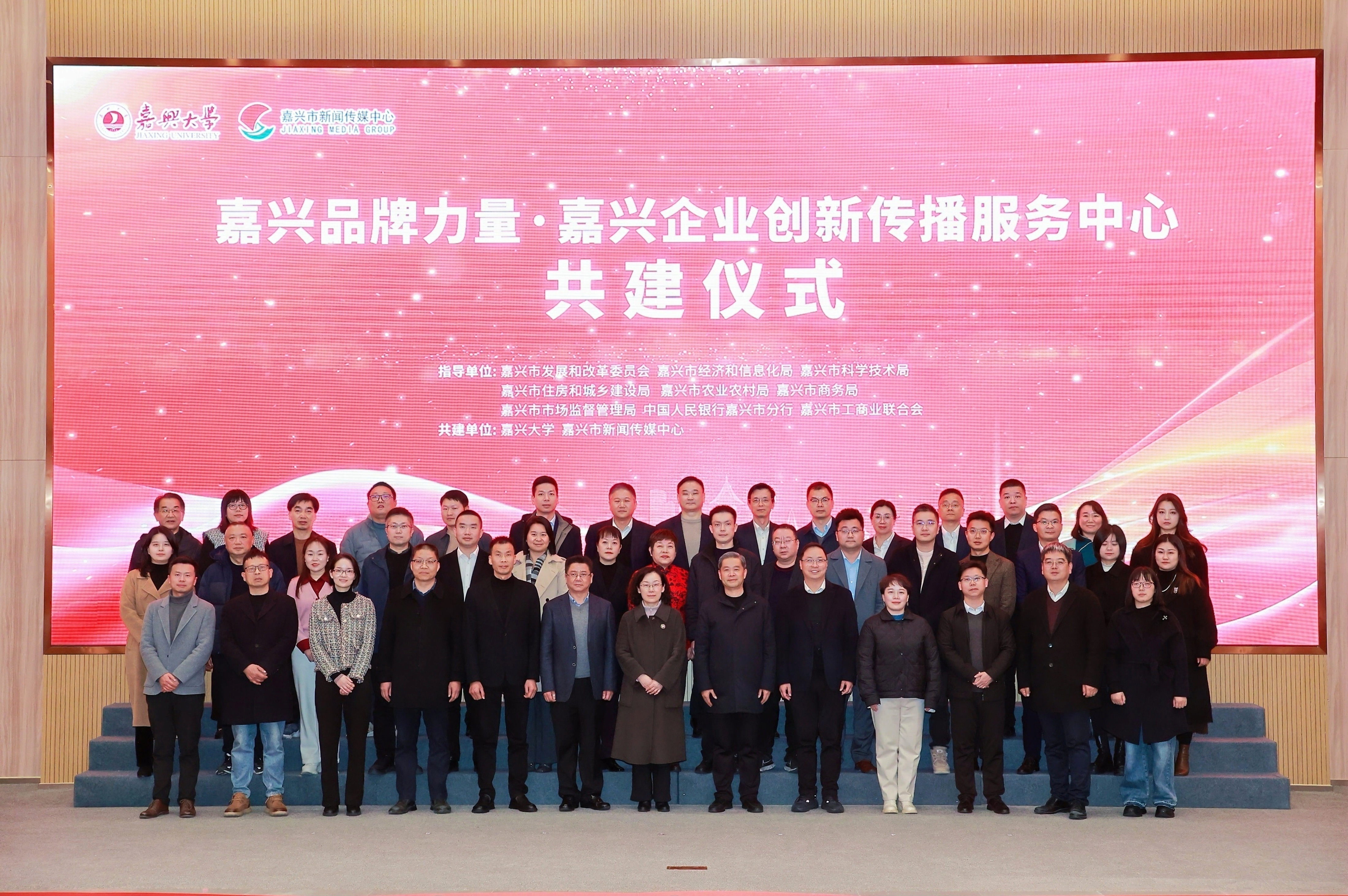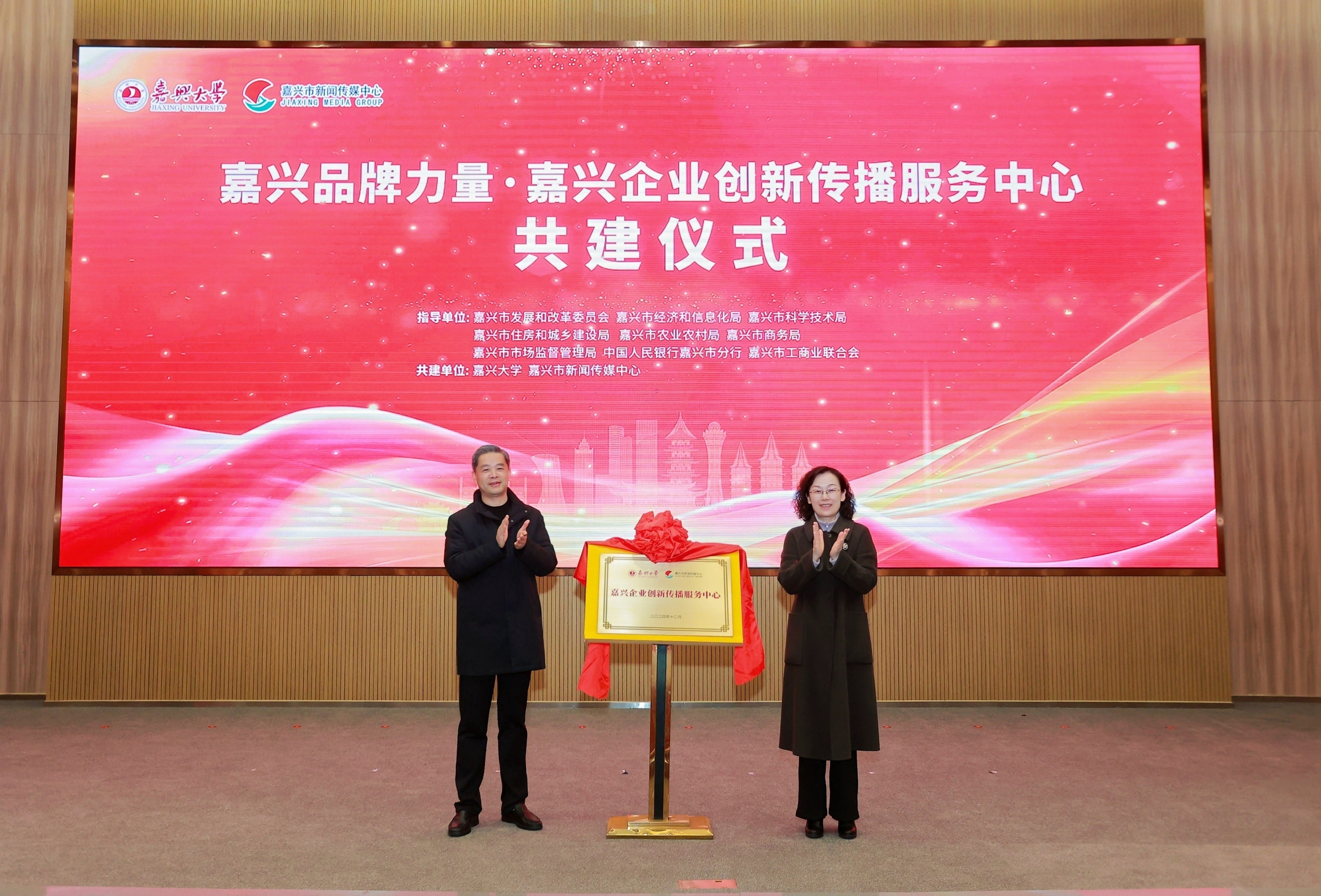 12月25日,嘉兴品牌力量·嘉兴企业创新传播服务中心共建仪式在我校举行。嘉兴市新闻传媒中心以及相关政府单位、企业相关负责人与代表,我校相关负责人与代表参加了共建仪式。