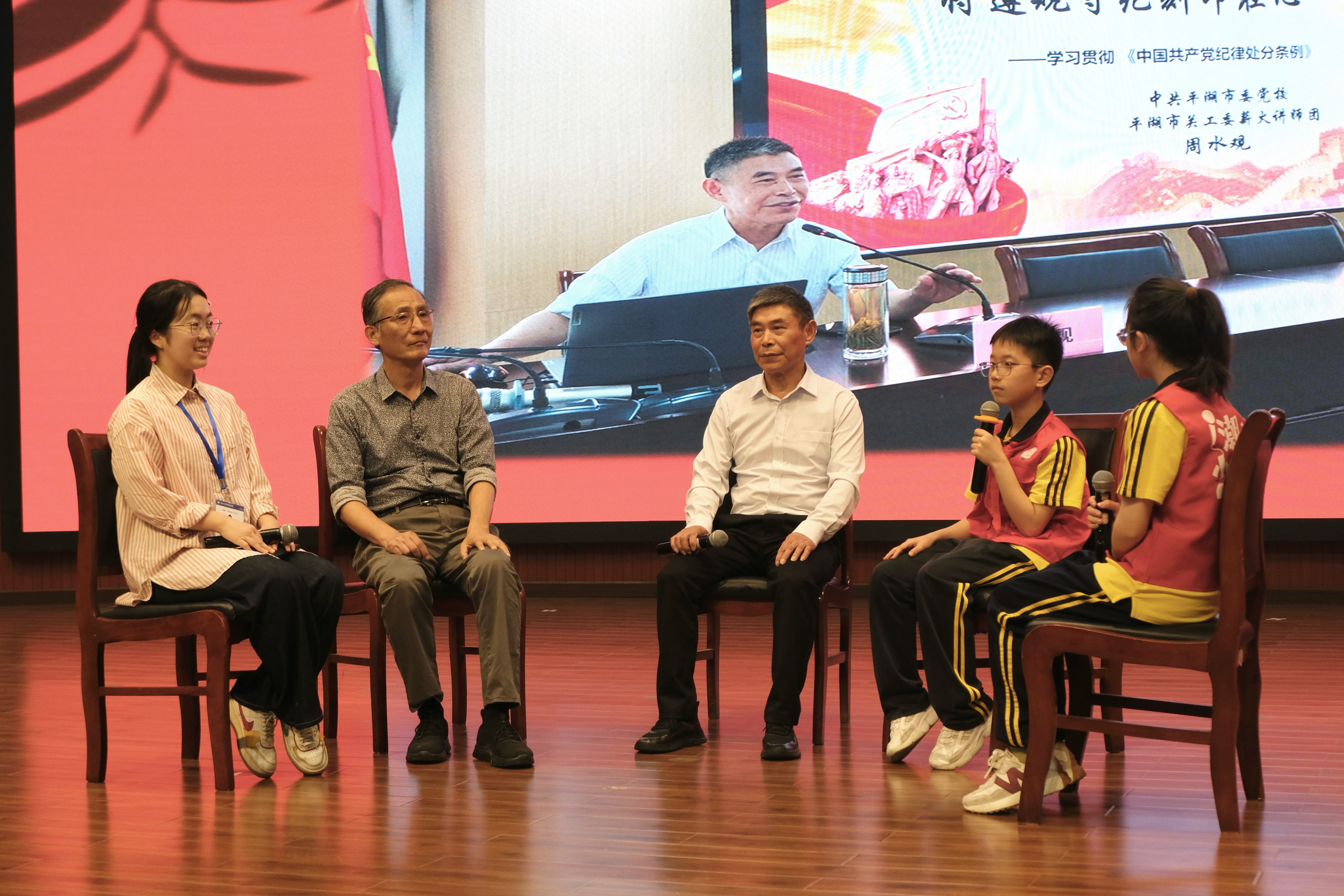 老少互动环节,“潮闻小记者”“红船小记者”和大学生代表与平湖市五老骨干周水观、平湖师范学院退休教师王利军进行了面对面交流,分享了对红船精神的理解和感悟,现场气氛热烈而温馨。