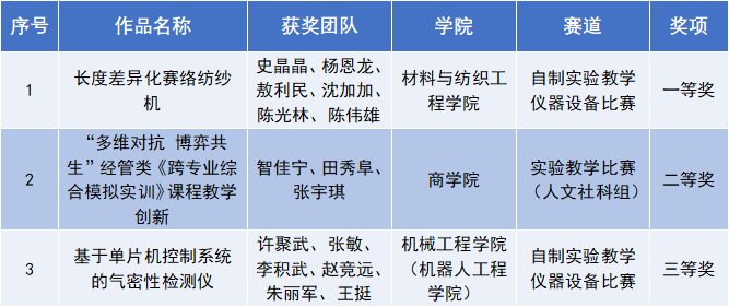 近日,由浙江省教育厅指导,浙江省高等教育学会主办,浙江省高等教育学会实验室工作分会等单位共同承办的浙江省第五届高校教师教学创新大赛实验技能专项赛落下帷幕。经激烈角逐,我校材料与纺织工程学院史晶晶团队获自制仪器比赛组一等奖,商学院智佳宁团队获实验教学比赛组二等奖,机械工程学院(机器人工程学院)许聚武团队获自制仪器比赛组三等奖,实现了学校在该项赛事中的历史性突破。学校荣获优秀组织奖。