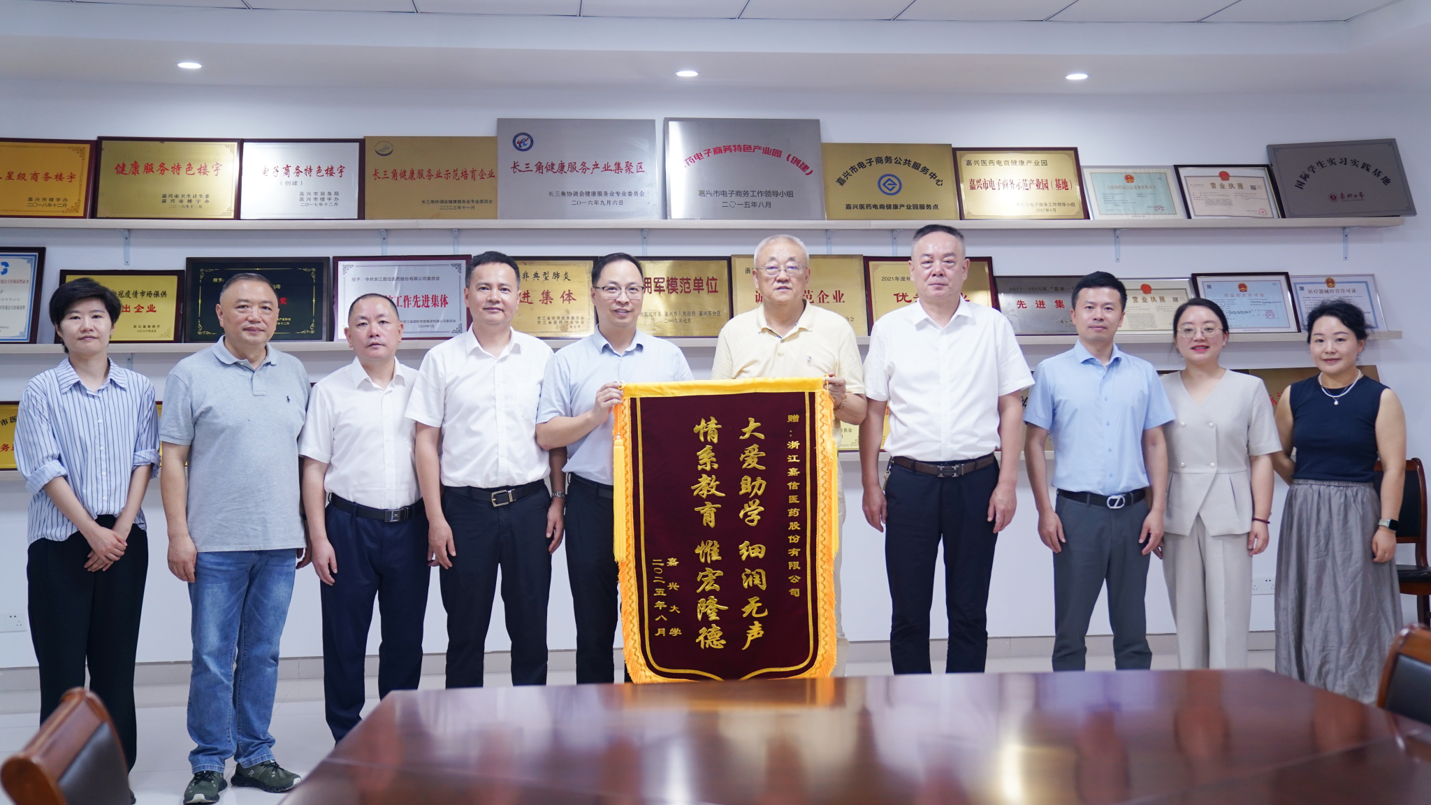 王立玮代表学校向嘉信医药赠送了镌刻着“大爱助学 细润无声 情系教育 惟宏隆德”十六字的锦旗。这面锦旗凝聚着所有受捐学子的感激,也铭刻了嘉信医药特别是蔡光復先生对嘉兴大学教育事业跨越二十载的坚定支持。多年来,嘉信医药始终践行“智仁勇”的企业精神,在社会公益领域累计投入超千万元,其教育慈善事业已成为嘉兴企业反哺社会的典范。