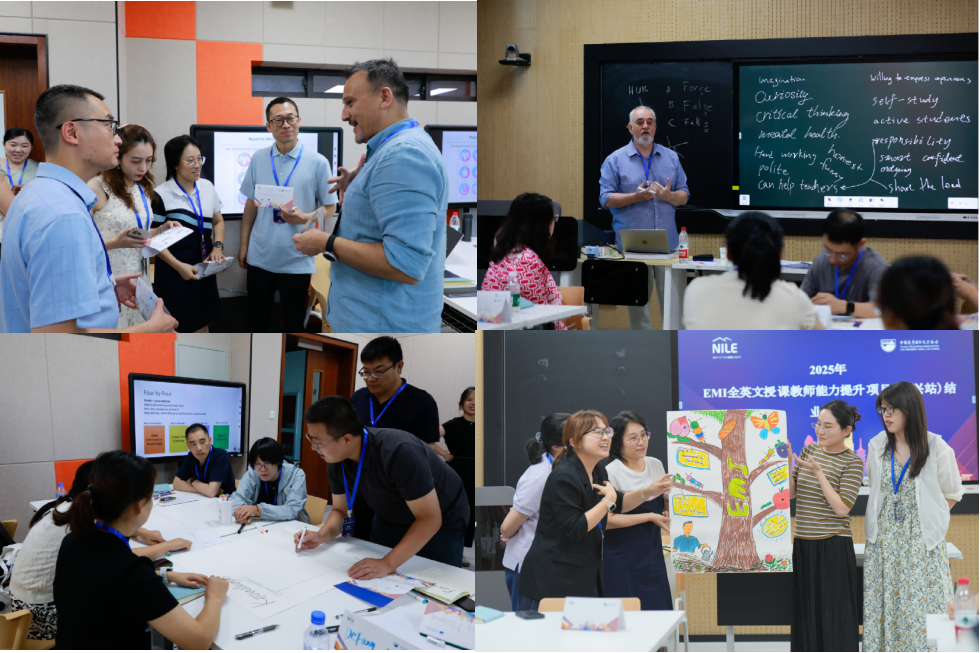 培训过程中,外籍专家THOMAS JAMES EDWARD与ARKIN ISMAIL ERKAN先生,以小班化、互动式、沉浸式的教学模式,通过课堂模拟、角色扮演、即时反馈等教学方式,围绕EMI教学理念、任务驱动式教学、学术语言应用、课程与课时设计、反馈与评价机制等主题展开系统讲授和研讨。学员们通过反思与问答环节巩固学习成果,并在小组讨论和展示中积极互动。