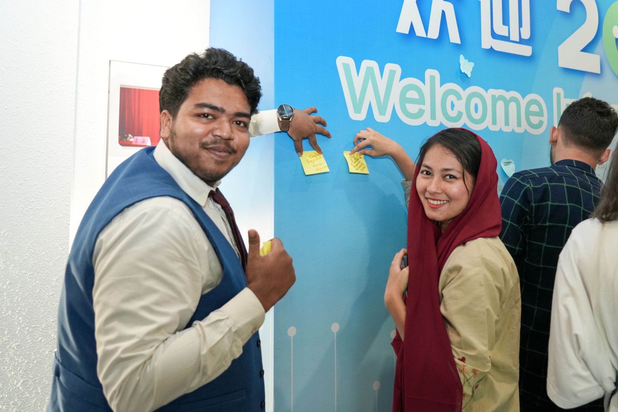 新生开学典礼上,举行了校徽佩戴仪式。活动现场,国际学生TRAN THUY NGOC还带来了精彩的才艺表演歌曲《多远都要在一起》。在活动的合影背景墙上,2025级新生们纷纷写下了自己对嘉大未来求学生活的期许。