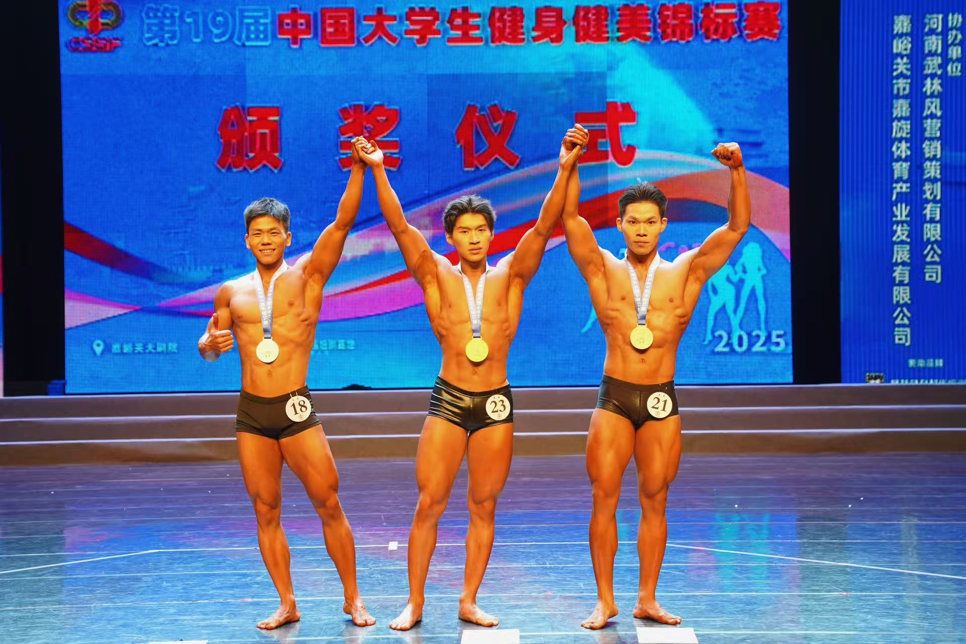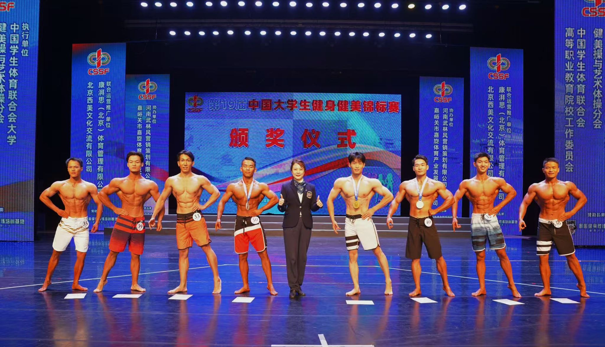 10月9日至14日,第19届中国大学生健身健美锦标赛在甘肃嘉峪关举行。本次赛事吸引了来自全国106所高校的运动员同台竞技。我校选手在此次比赛中表现出了优异的表现和出色的精神风貌,经过多轮紧张角逐,我校学子顶住强手压力,不负众望,斩获2项亚军、1项季军和1项第8名的好成绩。其中人工智能学院林佰潇同学荣获甲组传统健美65公斤级组别亚军,机械工程学院於涛涛同学荣获甲组古典健美身高171cm(含)以下组别亚军,设计学院刘倩楠同学荣获甲组女子健身比基尼A组165(含)以下季军,生化学院张钰坤同学在甲组男子健体A组174cm以下组别中表现优异,获得第8名。