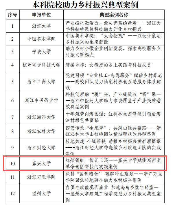近日,浙江省教育厅办公室公布了第四届高校助力乡村振兴典型案例评选结果,我校《红船领航智汇三溪——嘉兴大学赋能浙西南革命老区帮扶的实践案例》成功入选,成为全省15个本科院校助力乡村振兴典型案例之一。