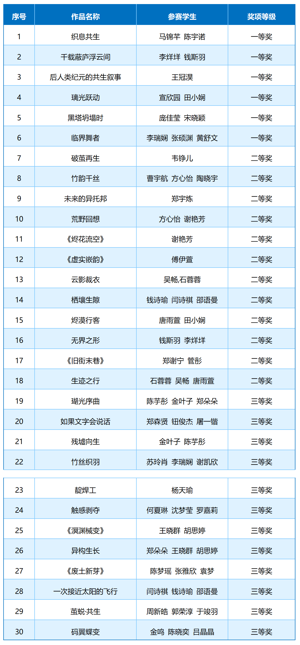 本届大赛以“共生·元创”为主题,设置服装服饰创意设计、构成创意设计、纺织品创意与文化叙事设计、智能穿戴式产品设计、AI+3D数智时尚创意设计五大特色赛道,全面覆盖时尚设计前沿领域。赛事吸引了省内33所高校学子踊跃参与,收到996组高质量参赛作品,其中488组优秀作品脱颖而出晋级决赛,展开巅峰对决。具体获奖名单如下: