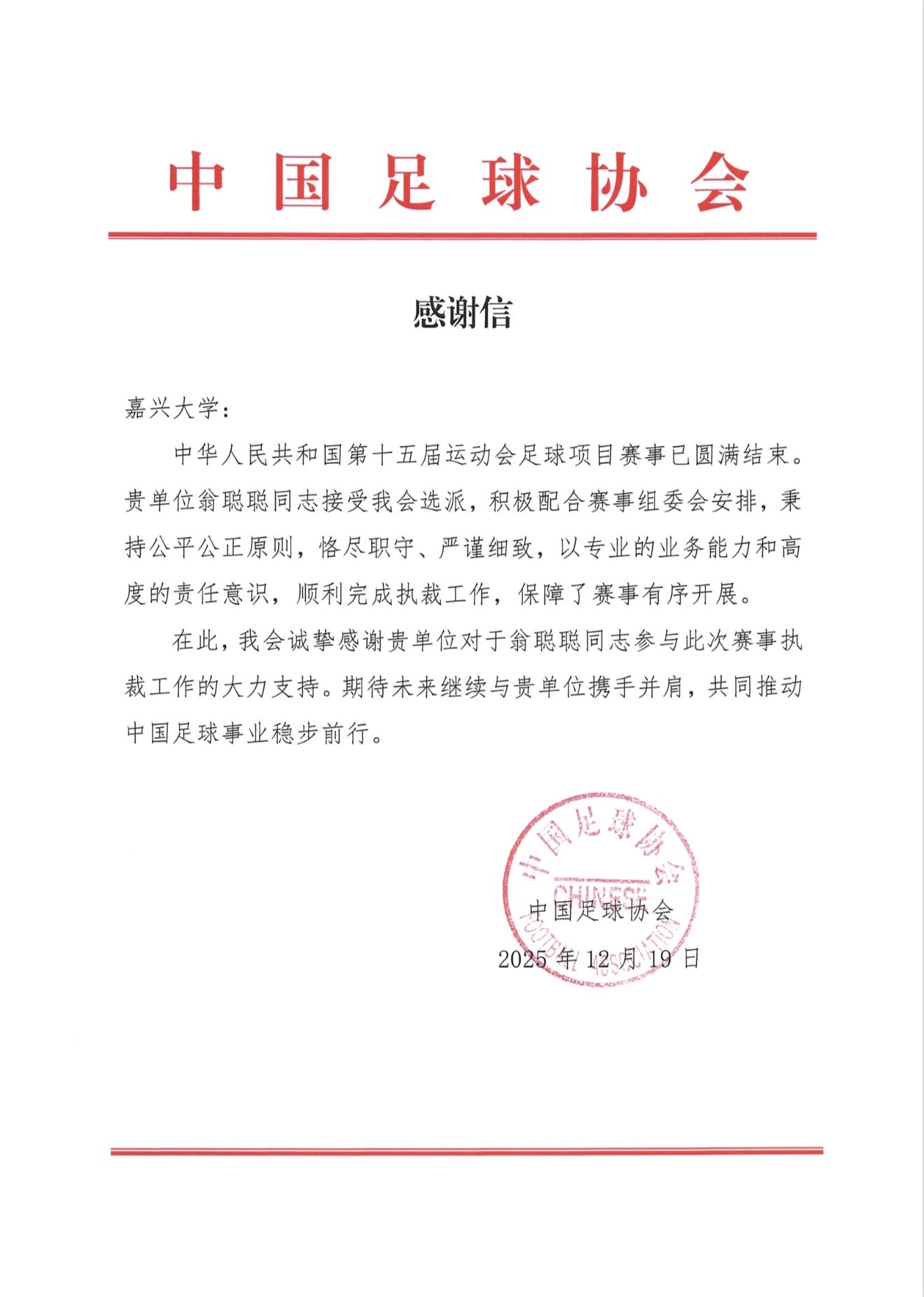 近日,中国足球协会向我校发来感谢信,对我校体育与军训部教师翁聪聪在第十五届运动会足球项目赛事中的出色执裁工作给予高度认可与诚挚感谢。