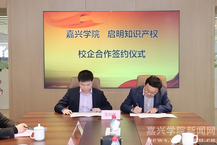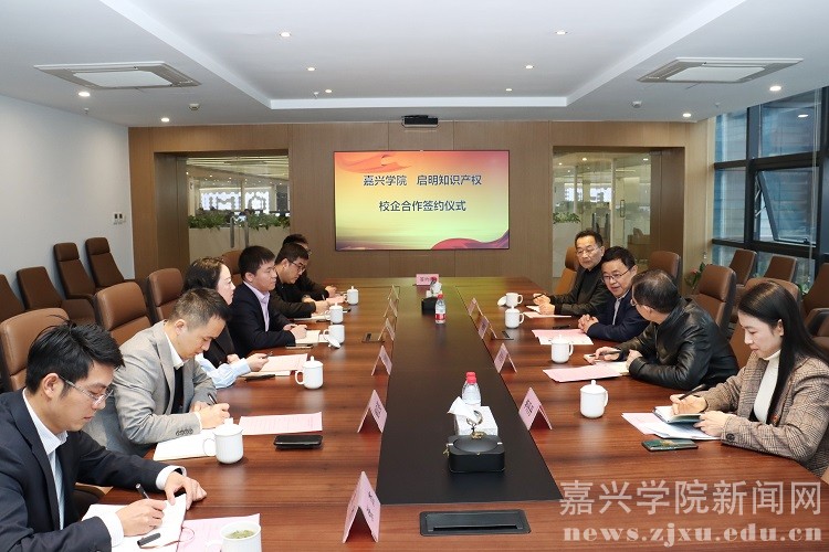 签约仪式后,与会人员围绕人才培养、科技成果转化等内容进行了交流。科技处、社会合作处、文法学院及嘉兴启明知识产权服务有限公司相关部门负责人参加仪式。