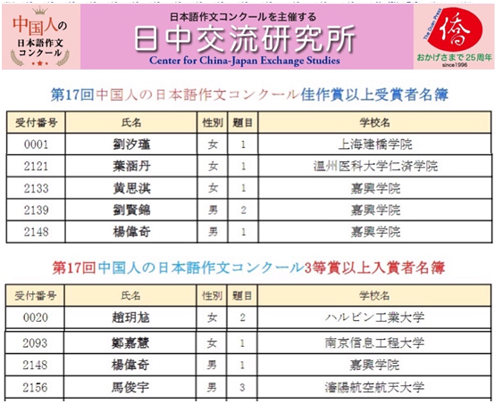 日前,第17届中国人日语作文大赛获奖名单揭晓。我校外国语学院日语专业杨伟奇同学获三等奖,黄思淇和刘贤锦两位同学获佳作奖;指导教师周艳君获“优秀园丁奖”。