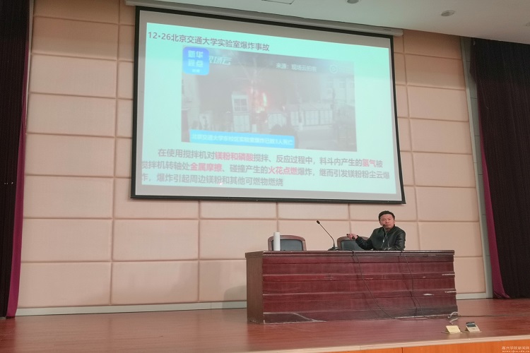 启动仪式上,邢博介绍了举办实验室安全教育宣传月的目的和活动内容,强调了实验室安全工作的重要性,希望全体同学牢固树立实验室安全意识并掌握相关安全知识。随后,学校生物与化学工程学院李以名博士给大家作了实验室安全培训讲座,结合生动事例和视频,从安全意识的提升、水电气安全知识及危险化学品使用等方面给大家带来了一场别开生面的讲座。