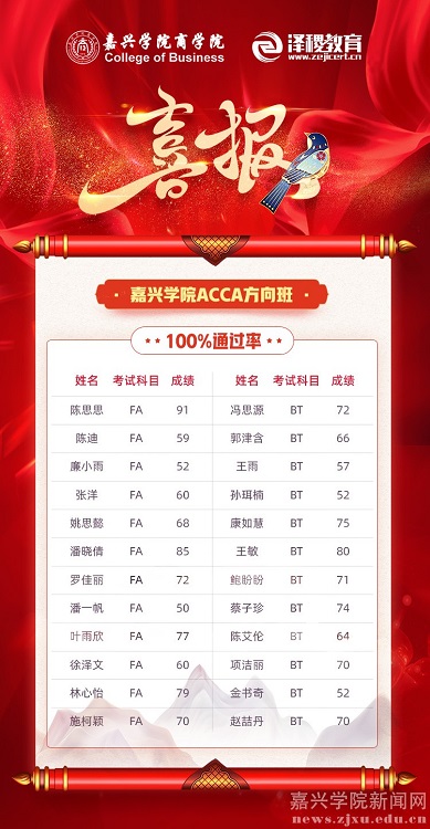 日前,商学院2019级会计学专业ACCA方向班24名同学全部通过ACCA不同科目的考试,通过率达100%。其中,陈思思同学在FA考试中发挥出色,取得91分的好成绩。