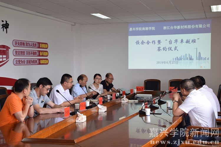 6月27日下午,南湖学院和浙江台华新材料股份有限公司合作开办的“台华卓越班”签约仪式在科工楼508会议室举行。学院院长袁志明、副院长仇恒喜、学工中心主任章马良和化纺系副主任孙诗清及相关专业负责人,浙江台华新材料有限公司人力总监左飞、人力资源经理贾方全等参加签约仪式。仪式由化纺系主任杨树主持。