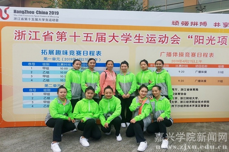 4月27日,浙江省第十五届大学生运动会“阳光体育”嘉年华竞赛活动在杭州下沙高教园区举行。本次比赛设有轮滑、拔河、跳绳、趣味拓展和九套广播体操等五个项目。