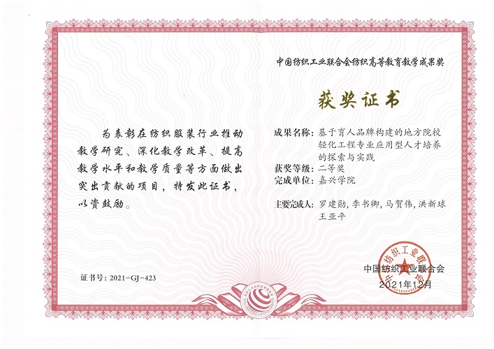 近日,“纺织之光”2021年度中国纺织工业联合会纺织高等教育教学成果奖评审结果揭晓并颁奖,由我校材料与纺织工程学院教师罗建勋、李书卿、马贺伟、洪新球、王亚平等组成的教科研团队申报的成果“基于育人品牌构建的地方院校轻化工程专业应用型人才培养的探索与实践”获二等奖。