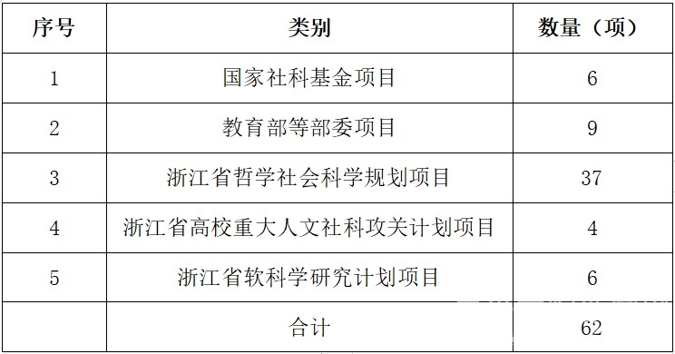 日前,浙江省科学技术厅公布了2024年度软科学研究计划项目,我校立项6项,其中重点项目2项、一般项目4项。截止目前,我校2023年共立项省部级以上人文社科项目62项(不含转入),其中重大项目3项、重点项目11项,立项数量再创新高。