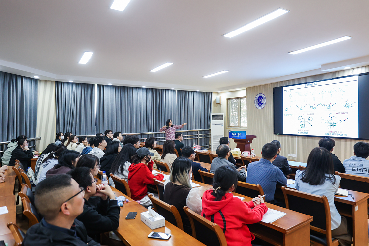 燕红院士介绍了碳硼烷衍生物在国防、材料、医药、能源等重要领域上的广泛应用。她表示,碳硼烷衍生物的应用离不开碳硼烷的功能化,其中碳硼烷B-H键功能化尤其是选择性功能化一直是合成的挑战。她对三类基于碳硼烷的新型非共价键弱相互作用的发现及应用,以及碳硼烷衍生物在聚集诱导发光和BNCT方面的应用研究情况进行了分享。互动交流环节,与会师生踊跃提问,燕红院士耐心地解答了师生们提出的问题,现场气氛热烈。