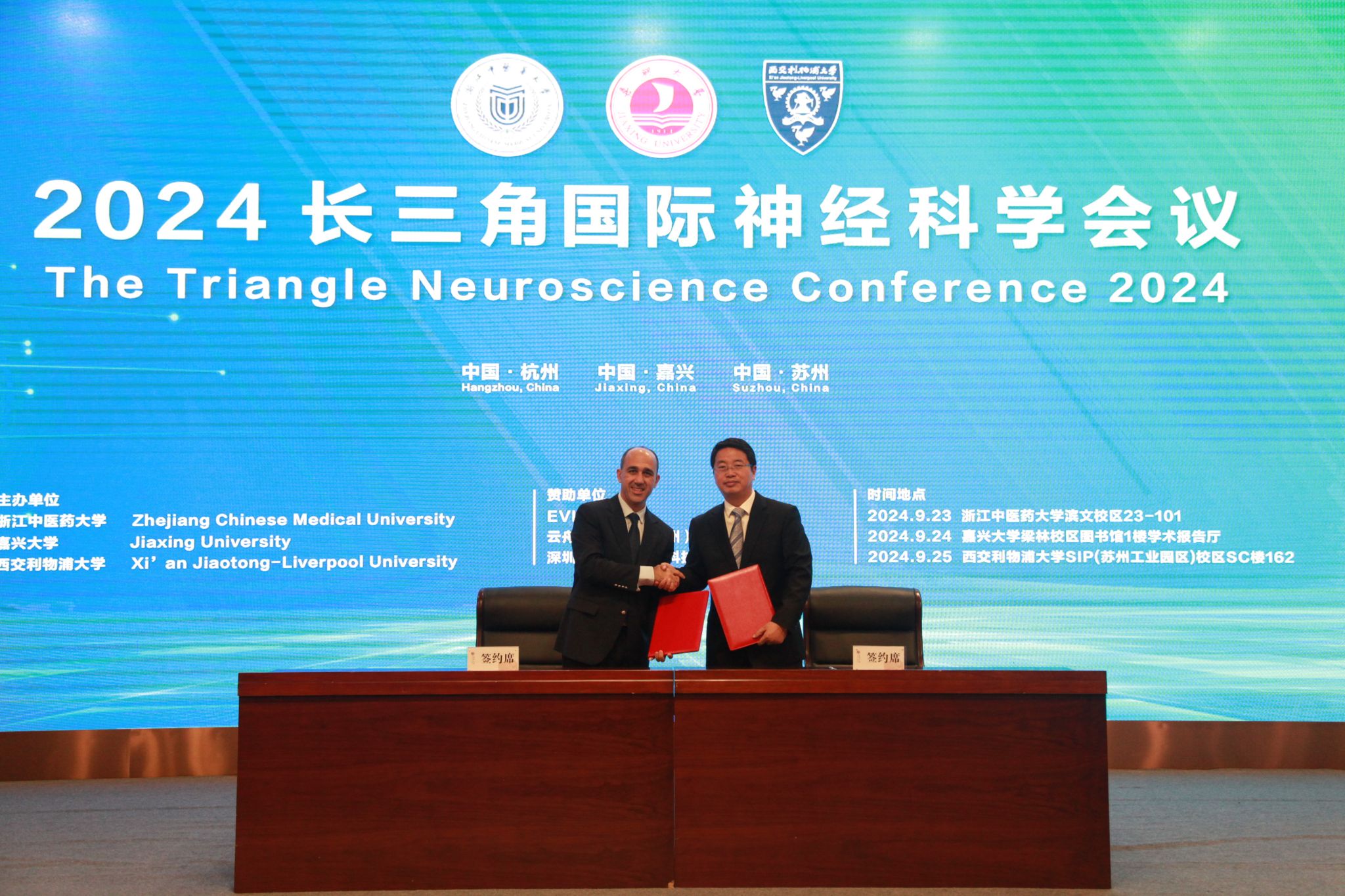 9月24日,由浙江中医药大学、我校和西交利物浦大学共同承办的“2024长三角国际神经科学会议”(The Triangle Neuroscience Conference 2024)在我校梁林校区学术报告厅举行。我校党委党员、副校长於建明,嘉兴市人民政府外事办公室主任沈文平出席会议并致辞。会议由我校教师、欧洲科学院院士Alexey Semyanov主持。