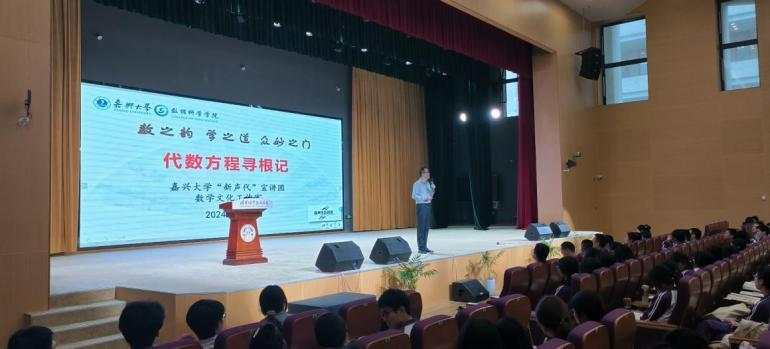 嘉兴大学数据科学学院副教授闵啸带队先后来到清华附中嘉兴学校以及嘉兴高级中学举办主题宣讲。闵啸以讲故事的形式,从嘉兴近现代的三位数学大家李善兰、陈省身和吴文俊先生讲起,展现嘉兴深厚的数学文化底蕴。他以大家熟悉的代数方程求根为主线,结合数学历史、数学故事、数学趣闻旁征博引,巧妙融入数学思想、科学理念、文化内涵、应用价值等诸多元素,向学生宣讲数学文化。