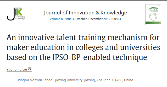 我校平湖师范学院刘原兵副教授在《Journal of Innovation & Knowledge》上发表了论文《An innovative talent training mechanism for maker education in colleges and universities based on the IPSO-BP-enabled technique》。《Journal of Innovation & Knowledge》作为跨学科期刊,致力于推进一系列领域的理论和实践创新知识。