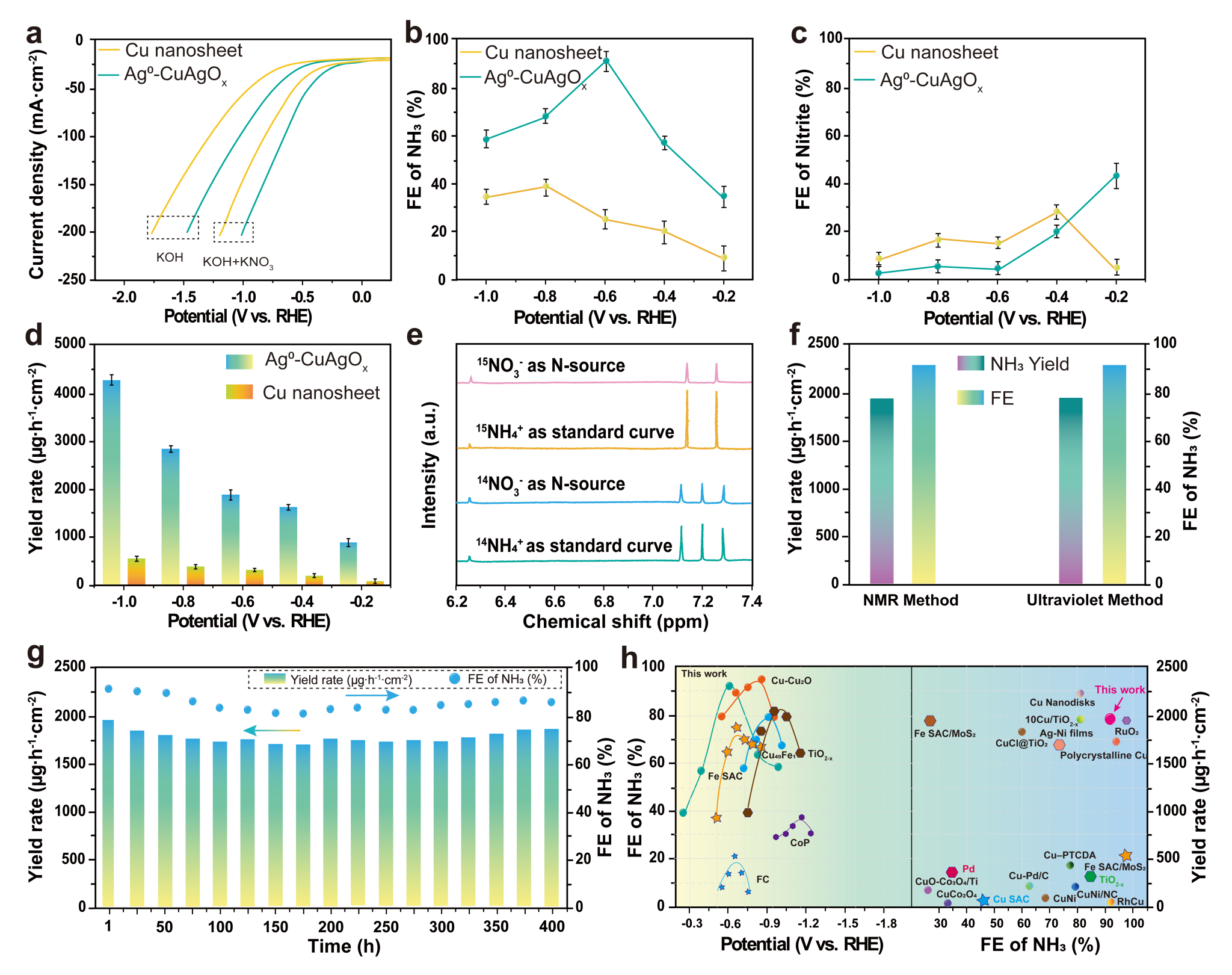 氨(NH3)是化学和农业领域生产合成纤维、药物和肥料的关键原料,也被视为理想的无碳能源,开发高活性和高选择性的电催化剂以进一步促进可持续的NH3合成至关重要。我校王燕刚教授团队利用双金属铜氧化物的动态调节策略来稳定催化剂中的活性位点,同时为了动态调节铜价态,该研究提出了一种在H2/Ar环境下可控低温热解CuAg氧化物的方法,以选择性地将部分Ag物种还原为Ag0,从而获得异质结构的Ag0纳米簇和改性的CuAg氧化物(Ag0-CuAgOx)。该研究为设计一类对特定催化活性位点具有保护功能的电催化剂提供了新思路。