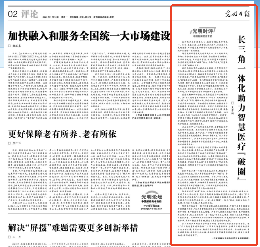 2025年1月13日,《光明日报》评论版刊登我校马克思主义学院教师王雪楠文章《长三角一体化助力智慧医疗“破圈”》。