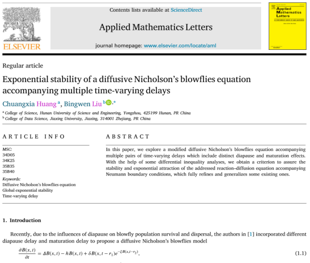 近日,数据科学学院刘炳文教授与湖南科技学院理学院黄创霞教授合作,在微分方程领域取得重要研究进展。相关研究成果以Exponential stability of a diffusive Nicholson's blowflies equation accompanying multiple time-varying delays为题,发表于国际数学类知名期刊《Applied Mathematics Letters》。