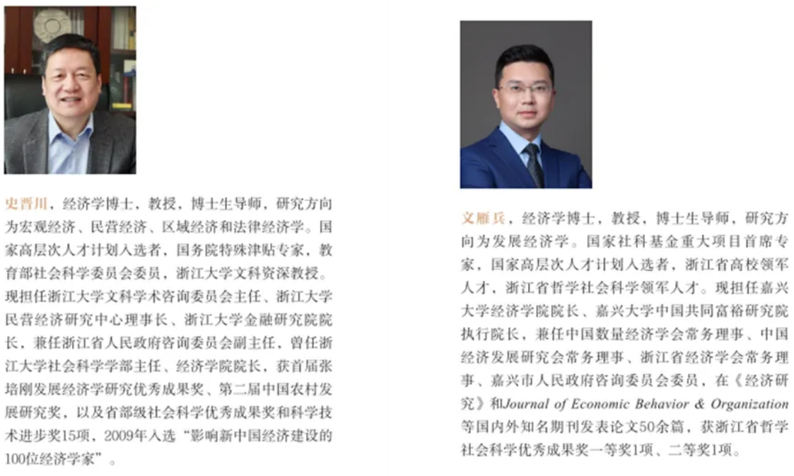 《中国民营经济简史》是浙江大学民营经济研究中心(教育部人文社会科学重点研究基地、国家哲学社会科学创新基地、浙江省哲学社会科学重点研究基地)立项的重点研究课题和浙江省哲学社会科学领军人才专项课题(25QNYC019ZD)成果。本书由史晋川教授(浙江大学民营经济研究中心)和文雁兵教授(嘉兴大学经济学院、嘉兴大学中国共同富裕研究院)牵头,以及任晓猛副研究员(浙江大学区域协调发展研究中心)、黄禾雨副教授(浙江财经大学经济学院)、任光辉副教授(浙江财经大学经济学院)、江庆勇副教授(浙江财经大学经济学院)、李钧副教授(浙江财经大学财政税务学院)共同完成。