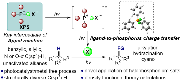 C(sp³)–H键的直接官能团化是有机合成中的核心挑战之一。传统方法往往依赖贵金属催化剂或苛刻的反应条件,限制了其在绿色合成中的应用。可见光催化作为一种环境友好的策略,近年来在药物分子修饰和功能分子构建中展现出巨大潜力。卤代鏻盐作为经典Appel反应中的中间体,以往主要用于醇的卤代反应,其光化学性质与多功能性尚未被充分发掘。