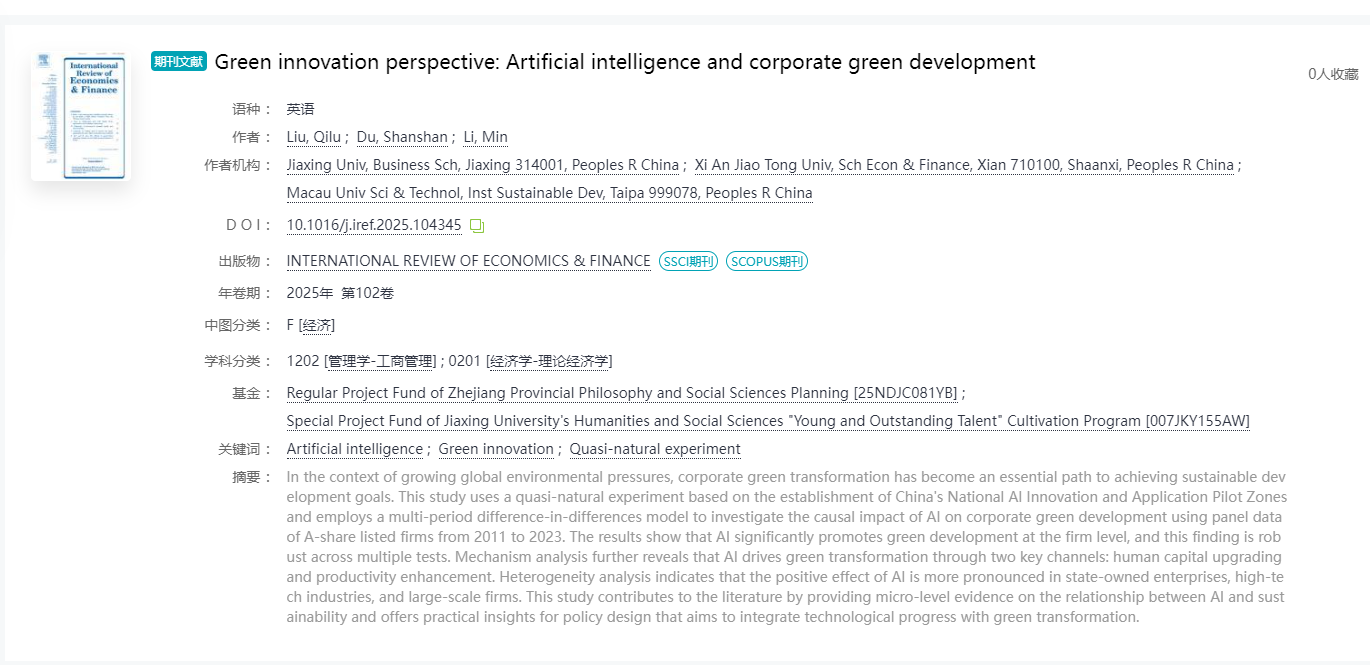 近日,我校商学院刘琦璐老师在《International Review of Economics and Finance》(中科院二区,影响因子5.6)上发表了题为《Green innovation perspective: Artificial intelligence and corporate green development》的研究论文。刘琦璐老师为论文第一作者,嘉兴大学商学院为论文第一作者单位。