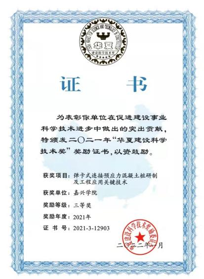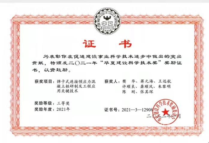 日前,全国建设科学技术领域的最高奖项——华夏建设科学技术奖2021年度获奖项目揭晓,我校作为参与完成单位,建筑工程学院蒋元海教授作为第二完成人的科技成果“弹卡式连接预应力混凝土桩研制及工程应用关键技术”荣获三等奖。