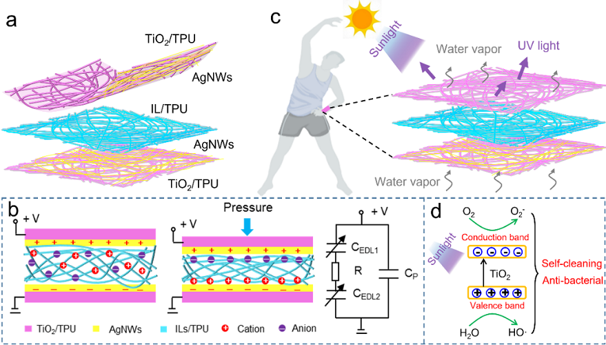在该项研究中,研究人员开发了一种具有全纳米纤维结构的柔性可透气电容式压力传感器,具有高灵敏度、良好的紫外线屏蔽、自清洁和抗菌等优异的综合性能。传感器由三层可透气的热塑性聚氨酯(TPU)静电纺纳米纤维薄膜组装而成。中间的介电层由负载离子液体的TPU纳米纤维构成,可提供自由离子与电极形成界面双电层从而增强传感器的信号强度和压力灵敏度。因此,该传感器表现出高灵敏度(6.21 kPa-1)、宽工作范围(23 ~ 120 kPa)、快速响应速度(170 ms)和恢复速度(135 ms),以及超过6000次加载/卸载循环条件下的良好稳定性。此外,在上下两电极层中填充纳米二氧化钛又可使传感器具有良好的紫外屏蔽、自洁和抗菌性能,是可穿戴电子产品在实际应用中需具备的理想性能。得益于这些优异性能,该传感器可应用于人体生理信号监测和可穿戴加密信息传输系统,显示出在可穿戴电子领域的巨大应用潜力。