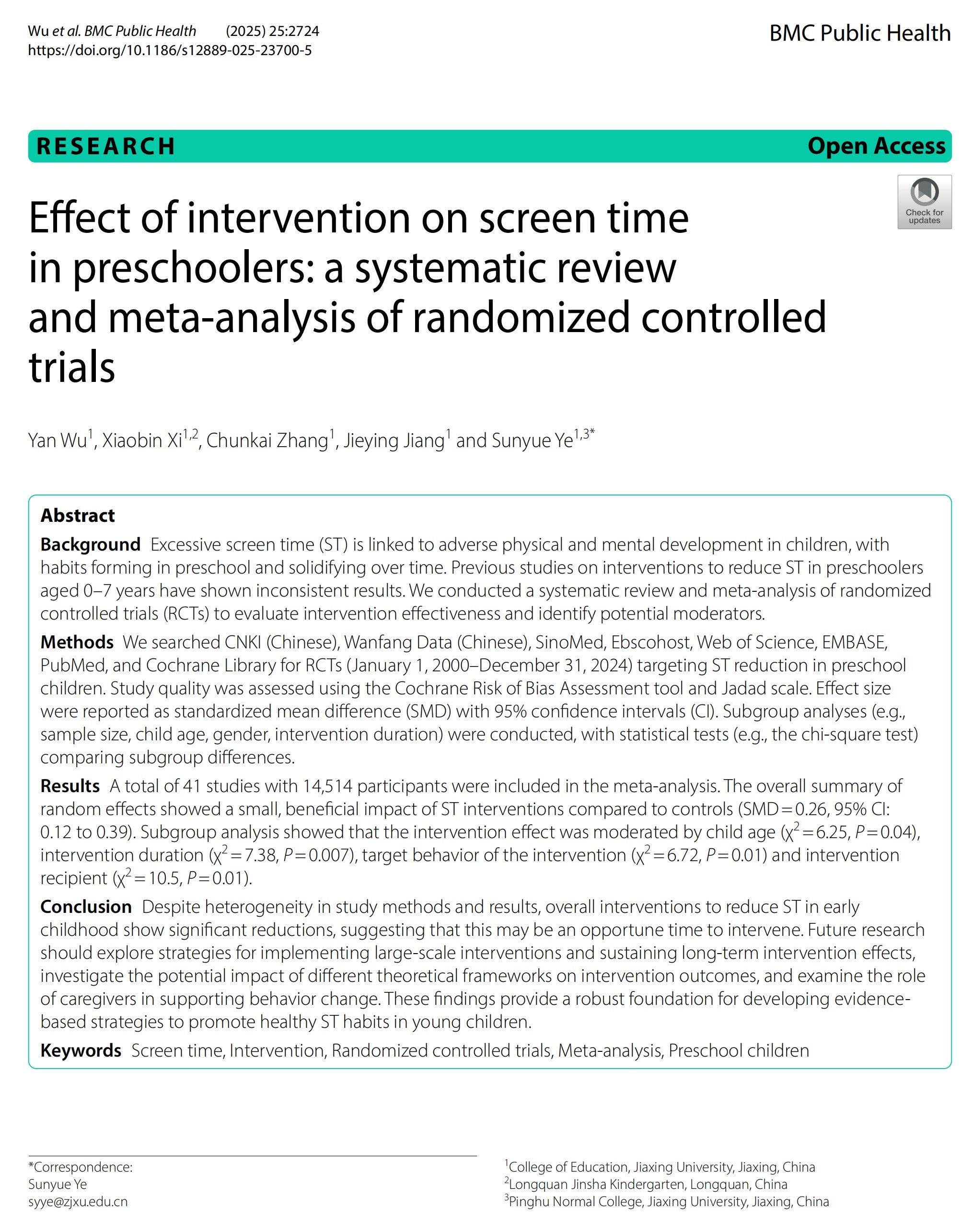 平湖师范学院、教育学院师生在《BMC Public Health》(中科院SCI二区)发表研究论文,系科研创新团队合作成果。论文由叶孙岳教授任通讯作者,吴燕博士任第一作者,学前教育专业本科生奚潇斌等参与,体现教师科研合作与本科生科研培养的融合效果。该研究系统分析了2000-2024年发表的41项相关随机对照试验结果,涉及14514名0—7岁儿童,评估干预措施减少幼儿屏幕时间的有效性及影响因素。结果显示,干预措施整体可显著减少屏幕时间,且干预效果受儿童年龄、干预时长等因素影响。此研究为家庭、教育工作者及公共健康政策制定者提供了科学依据。