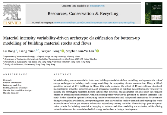 近日,设计学院教师董璐以第一作者身份在环境科学与生态学领域国际著名期刊《Resources, Conservation & Recycling》(中国科学院一区TOP,影响因子13.2)上发表题为“Material intensity variability-driven archetype classification for bottom-up modelling of building material stocks and flows”的研究论文。嘉兴大学为论文第一署名单位,剑桥大学袁亮博士为通讯作者,香港大学刘少瑜教授为论文共同作者。