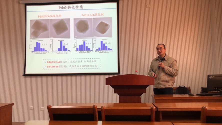 倪珺首先介绍了从不可再生的化石资源出发,可以得到乙烯、丙烯、丁二烯等烯烃,以及苯、甲苯、二甲苯等芳烃的观点;然后,说明了这些原料物质经过化学加工可以制成品种繁多、用途广泛的有机化工产品,从而构成了传统石化行业的产业链。他重点讲解了乙醇作为新兴的生物质资源,不仅可以催化转化得到烯烃和芳烃,还可以合成高附加值的高碳醇。本次报告侧重于介绍在乙醇制高碳醇方面的研究进展,以及近期在面向工业化催化剂构筑方面的探索工作。讲座之后,倪珺耐心详细地解答了师生提出的问题,并进行了深入交流。