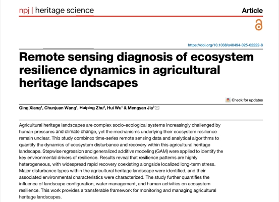 近日,设计学院环境设计系项清博士团队在文化遗产领域权威期刊《npj Heritage Science》发表题为《Remote sensing diagnosis of ecosystem resilience dynamics in agricultural heritage landscapes》的研究成果。论文以嘉兴大学为第一署名单位,项清博士为第一作者。