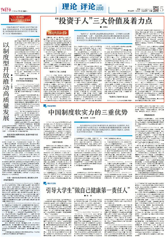 2026年1月5日,经济学院文雁兵教授在《中国青年报》理论版“理论热点面对面”发表文章《“投资于人”三大价值及着力点》。文章指出,“投资于人”是实现人的全面发展的必然要求,它不再将人仅仅视为实现发展的“工具”,而是强调人的价值实现和福祉提升本身就是发展的目的,将人的发展置于现代化建设的核心位置,彰显着顺应人民群众对美好生活期待的价值旨归。
