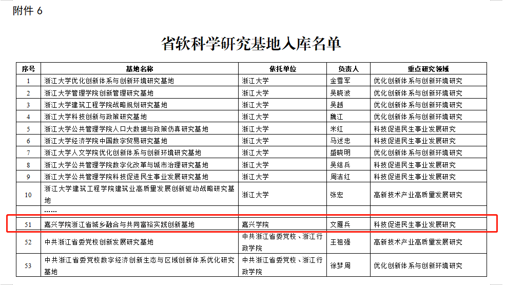此外,以研究院执行院长文雁兵教授作为负责人申报的“嘉兴学院浙江省城乡融合与共同富裕实践创新基地”成功入选浙江省科技厅首批省软科学研究基地。