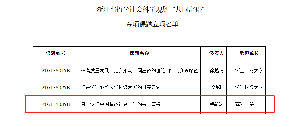 由学校党委书记、研究院院长卢新波教授申报的“科学认识中国特色社会主义的共同富裕”获省哲学社会科学规划“共同富裕”专项课题立项;研究院常务副院长顾骅珊教授联合嘉兴市金融办撰写的《嘉兴市推动“融资畅通工程”迭代升级 实现金融资产高质量发展》,获得浙江省副省长朱从玖肯定性批示。
