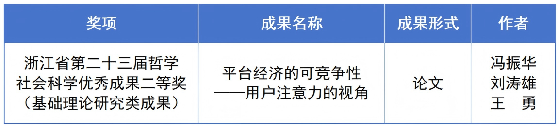 近日,第二十三届浙江省哲学社会科学优秀成果奖公布,经济学院冯振华副教授作为第一作者、嘉兴大学作为申报单位完成的论文成果《平台经济的可竞争性——用户注意力的视角》荣获浙江省第二十三届哲学社会科学优秀成果二等奖(基础理论研究类成果)。