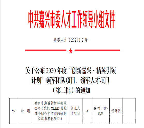 近日,嘉兴市公布了2020年度“创新嘉兴·精英引领计划”领军团队项目、领军人才项目(第二批)名单,我校G60科创走廊产业与创新研究院在孵企业嘉兴市海睿新材料有限公司CEO余鹏博士领衔的“柔性OLED触控屏全贴合光学胶的研制及成果转化项目”获评A类人才项目。